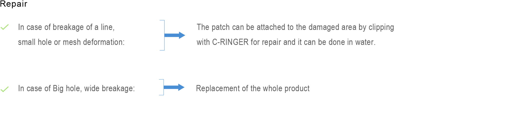 After conducting several tests in the overseas market, this product earned a good reputation. The part of intersection is firm enough to be called as a forever square mesh. It is easy to clean because seaweed dose not stick well on it. It is plasticized by melting only the surface of ultrafine fibers- filament, by processing with high temperature. The core is still a fiber state, so it does not break even when it is being bent.