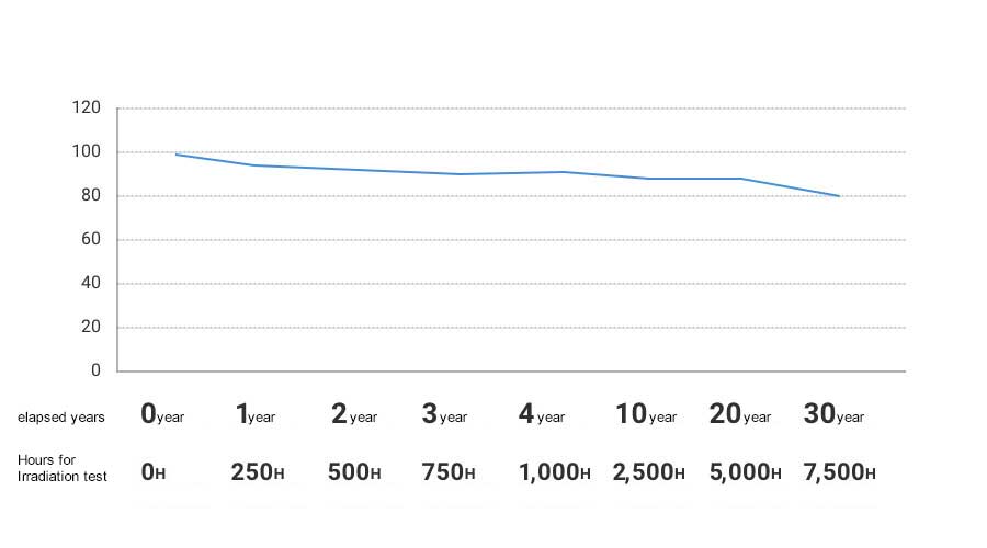 Weatherability test by yarn maker had been conducted with the Sunshine Wadermeter method. See the data on the right. UV Irradiation test had been conducted during 1 year with 250 hours. 7500 hours test conducted- equivalent to 30 years. The test proved that it maintained the strength of 90% or more even after more than 20 years.